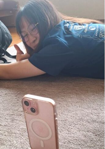 スマホが立ったと大興奮のさくちゃん(さくらさん)。スマホを
