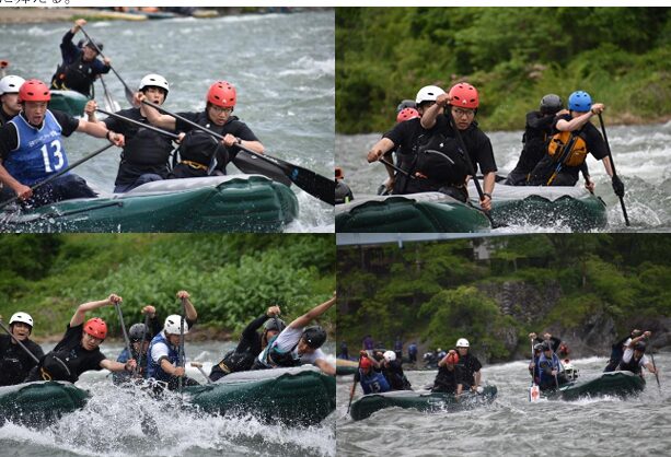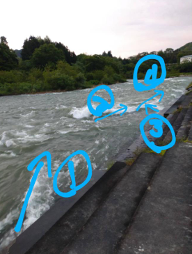 優先してちゃんと切る、その方が速い。その後左からと右からぶつけられ2-3段目は白波に乗ってしまい右から抜かされかけるが、各々がパドルをとったりアングルをたててルート管理でき、何とか勝てた。