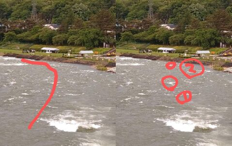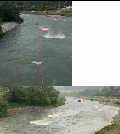 枯草(青☆)区間までを前半区間、枯草以降を後半区間とする。前半区間での反省点はアングルが大きくブレたことだ。枯草に向かっていきたいのだが枯草よりも下に向きアングルが定まらなかった。そのたびに、左が漕げとムロは怒鳴るが、みんなでアングルを定めることをより意識した