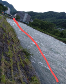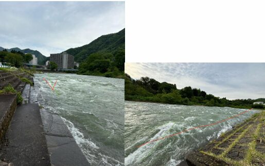 岸への流れが強く、気を抜くとすぐに右アングルになってしまう流れであった。この水量で降下した
